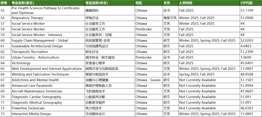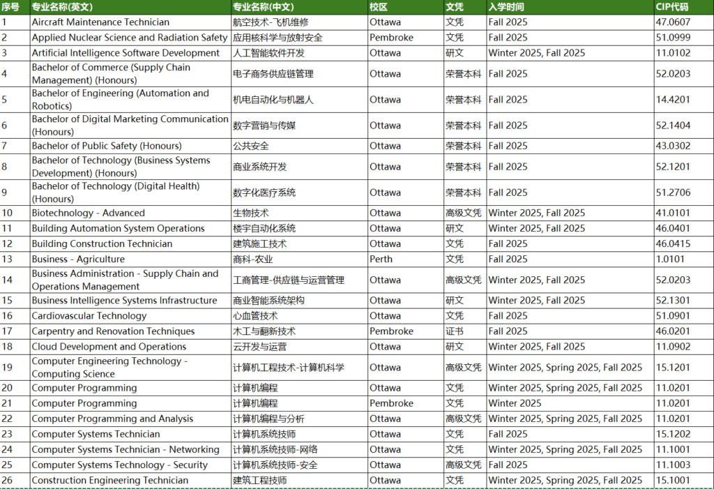 Based on the current guidelines from Immigration, Refugees and Citizenship Canada (IRCC) and Algonquin College’s review of the Classification of Instructional Programs (CIP) definitions used to identify PGWP Eligible Fields of Study, below is the list of our programs that we believe meet the IRCC field of study requirements for PGWP eligibility as of November 1st 2024. PGWP eligibility is not based on program quality or regional labour market demands but on national long-term labour market needs identified by IRCC. Please note that this list may be subject to change in the future.