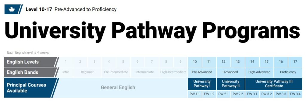 Students take a placement test before they start to determine their English level. Students who test at level 10 or above directly enter the University Pathway Program. Students who test at Level 9 or below begin in the General English program.