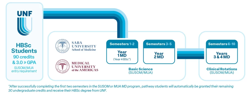 Through this pathway, after you complete 90 credits of your HBSc degree program at UNF you can progress directly into the MD program at Saba University School of Medicine (SUSOM) or Medical University of the Americas (MUA), subject to meeting the specific admission requirements of your chosen medical school.